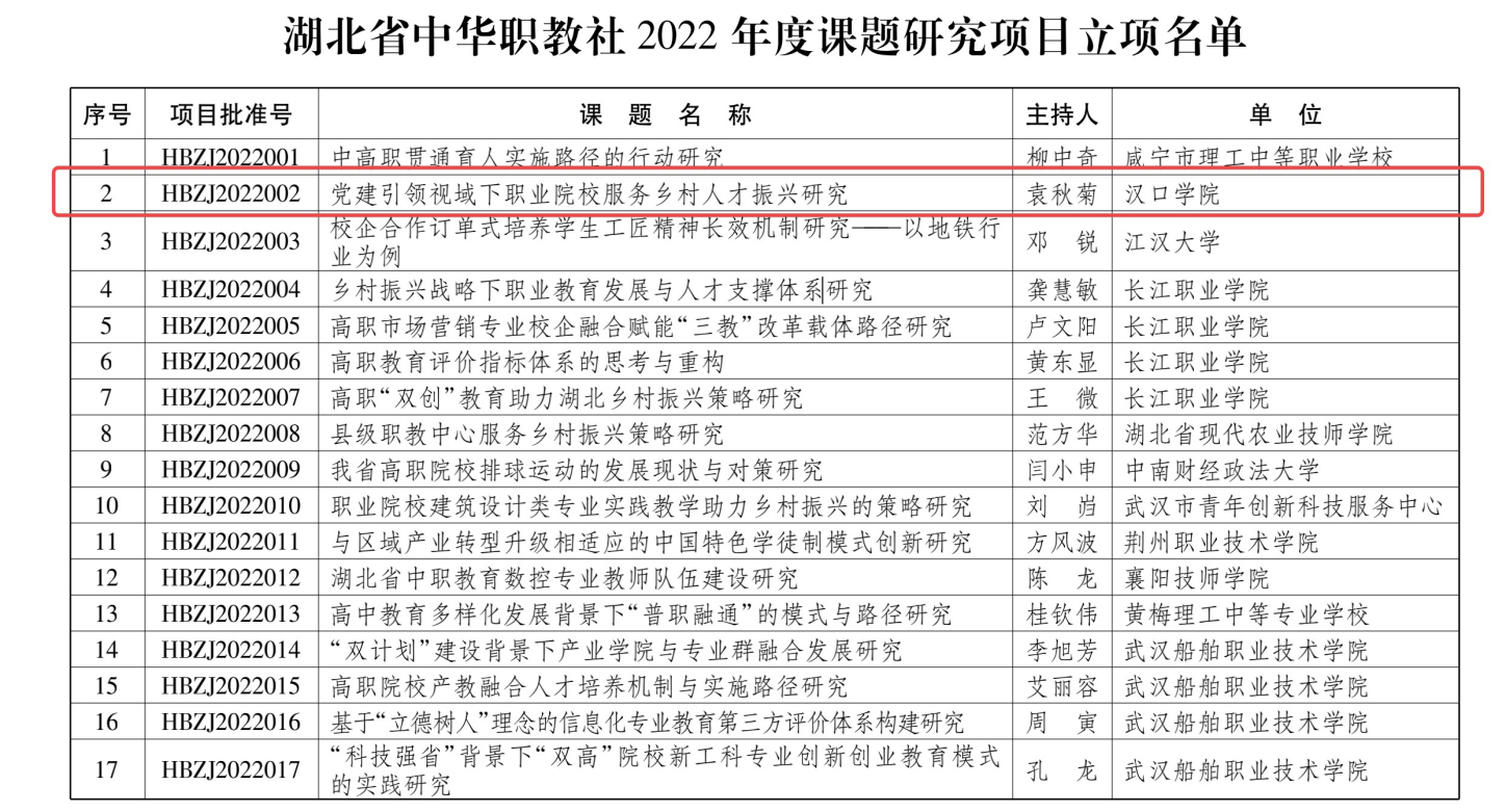 根据湖北省中华职业教育社的2022年度湖北省中华职教社2022年度课题研究项目立项名单,我校管理学院院长袁秋菊教授《党建引领视域下职业院校服务乡村人才振兴研究》获批中华职业教育社课题研究项目立项。