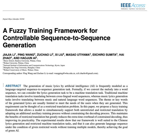近日,我校音乐学院青年教师李佳佳在国际权威期刊《IEEE Access》(SCI索引,中科院二区Top,影响因子: 4.34)上发表题为“A Fuzzy Training Framework for Controllable Sequence-to-Sequence Generation”的研究论文,实现了我校在该国际顶级期刊上新的突破!