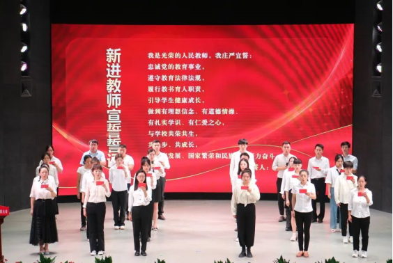铮铮誓言,是不变的初心,是始终如一的坚守。新进教师代表进行宣誓,要忠诚党的教育事业,遵守教育法律法规,履行教书育人职责,引导学生健康成长,成为有理想信念、有道德情操、有扎实学识、有仁爱之心的优秀教师。